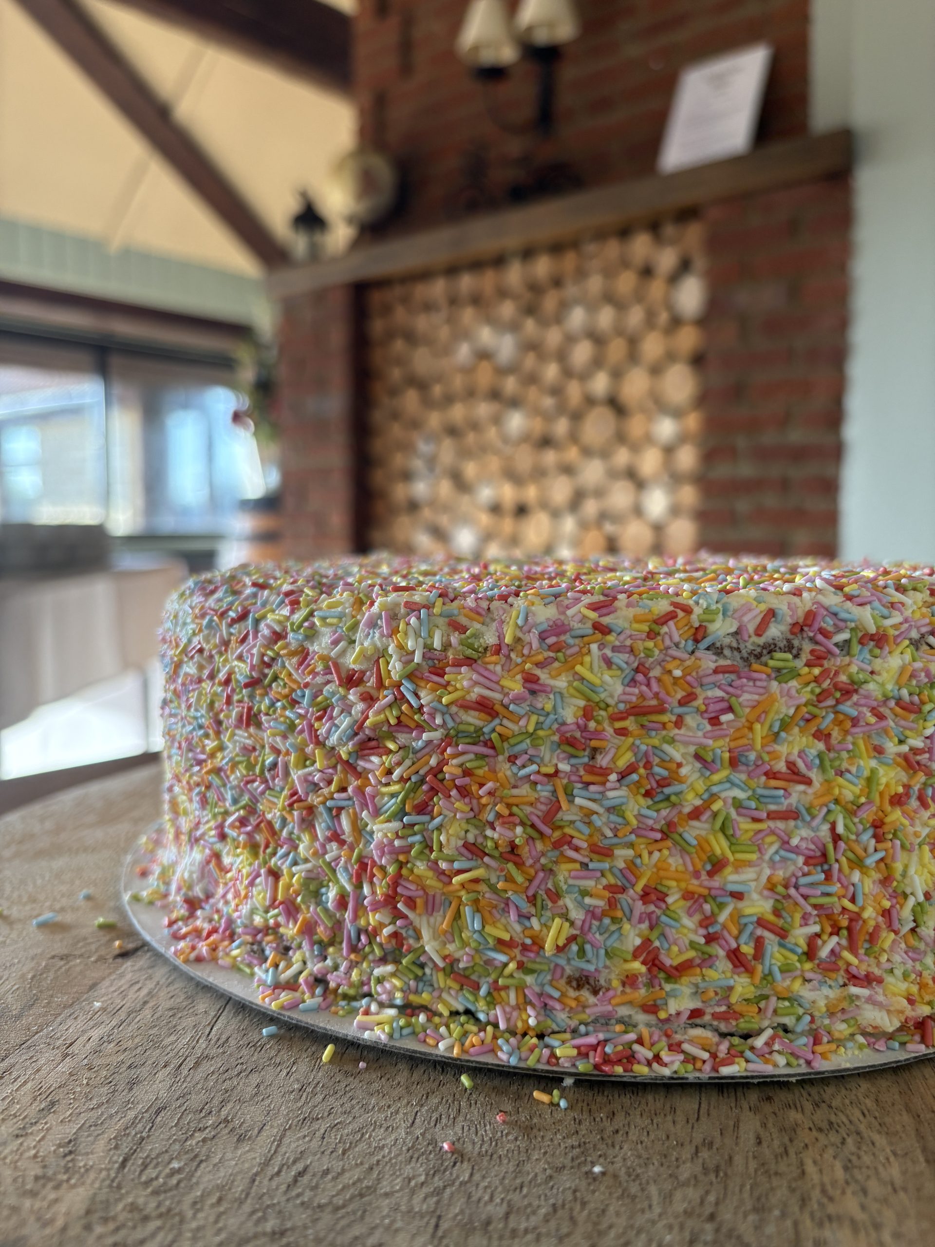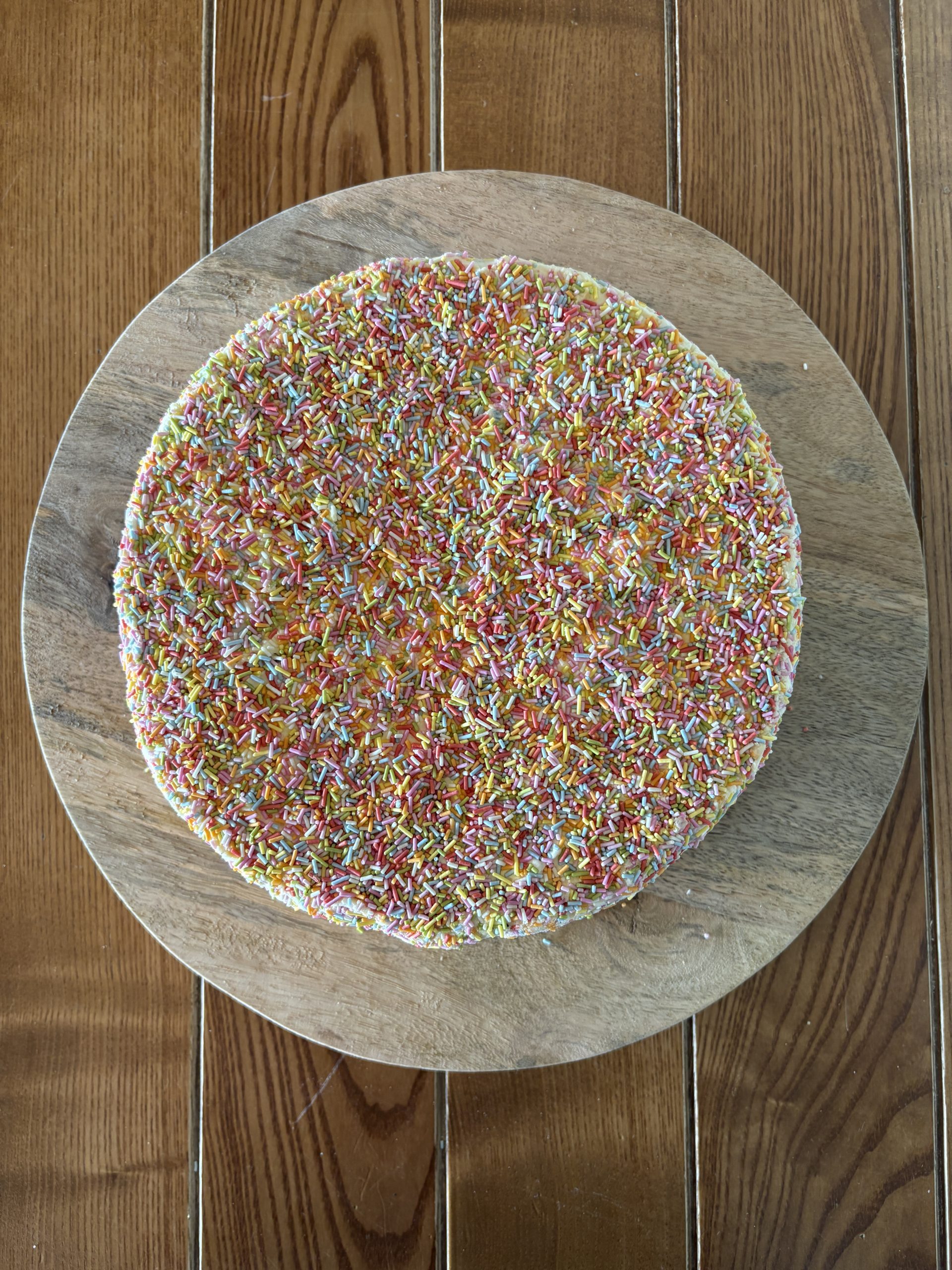 10” round vanilla rainbow cake covered in vanilla buttercream and sprinkles. £45. Serves up to 16 slices or 30 party bag portions.